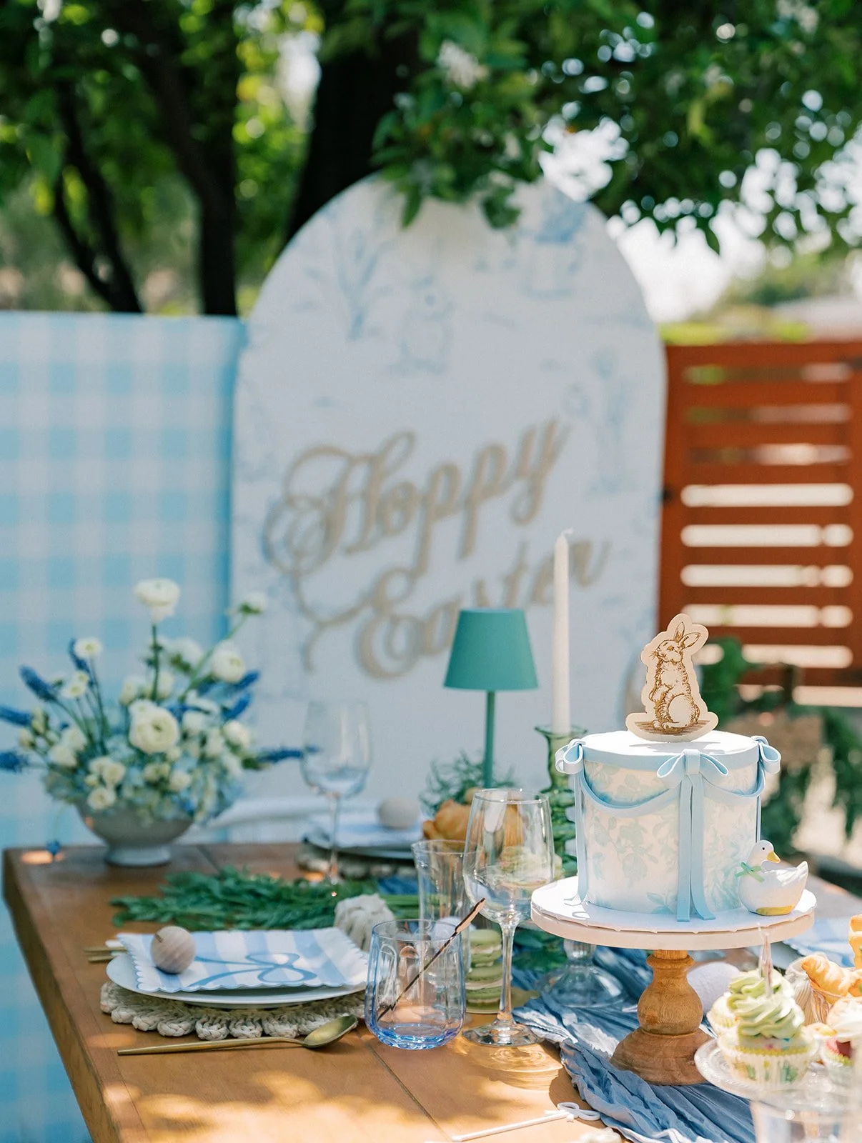 Fiesta Events brought the sweetest springtime charm to the party with their gorgeous wooden tables and wishbone chairs—so simple, so elegant, and so perfect for the season. Their white wooden bar made the dessert display feel extra special. Behind it all, Motion Laser Design created a custom backdrop that stole the show with its mix of classic blue gingham and a soft, toile-inspired print. We added our engraved Hoppy Easter sign to the top to bring the whole scene together.